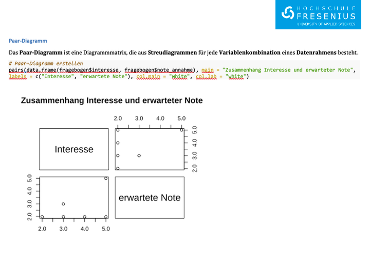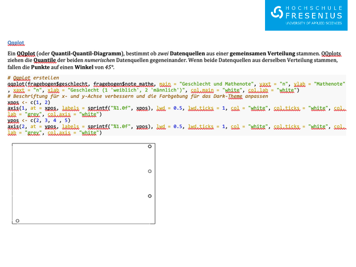 Auf Ilias sind die Vorlesungsfolien sowie alle R-Skripte und sonstiges Material. Hier findest Du in ansprechender Weise aufbereitet Diagramme oder statistische Methoden und deren R-Code (dieser liegt zusätzlich auf Ilias im Ordner “Beispiel-Datensätze, Python und R-Skripte”). Der Code wartet darauf von Dir ausprobiert zu werden!