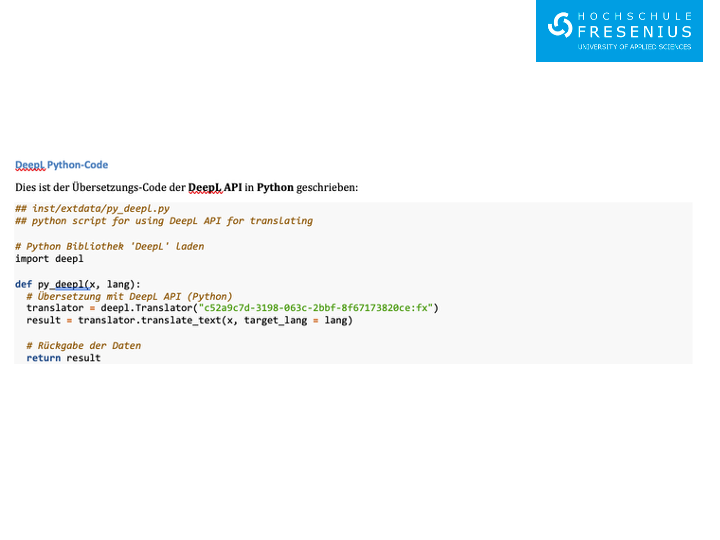 - translate(x, target_lang) – Übersetzt Text in die Zielsprache mit der DeepL API.